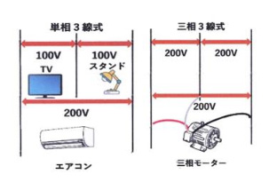 単相・3相交流:図のように100Vと200Vの違いは、「100V=家庭向け、200V=ビジネス向け」という理解が日本では一般的です。